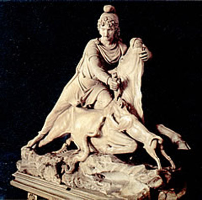 Az isten arca egy majdnem lányos szépségű ifjú arca: a lehulló dús hajfürtök dicsfényként veszik körül arcát, feje könnyedén hátrahajlik, tekintetét az égre veti, félig csukott szeme, összeszorított ajkai egy sajátos fájdalom kifejezői.