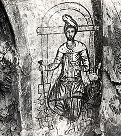 A fő kultuszképen Mithras alakja a hagyományos ábrázolásmóddal megegyezik.